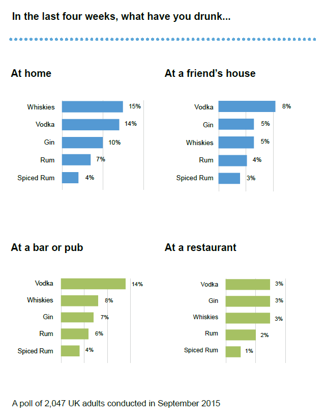 But while vodka is the tipple of choice for Britons out and about, when at home they turn to whiskey as this chart shows: