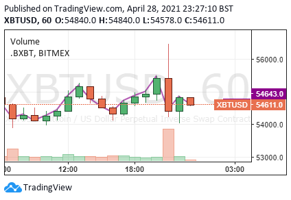 So strong were the tip-offs that Bitcoin threw up a wick to $56,490 as the announcement began before flopping to $54,300 as it became painfully apparent that the tantalising thought of Facebook ploughing vast sums of US dollars into crypto was actually a damp squib.