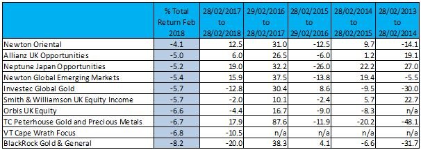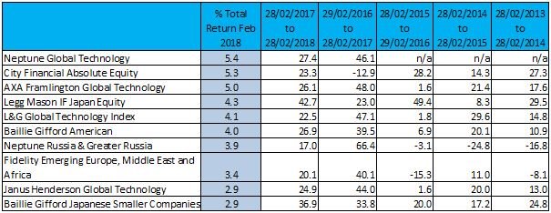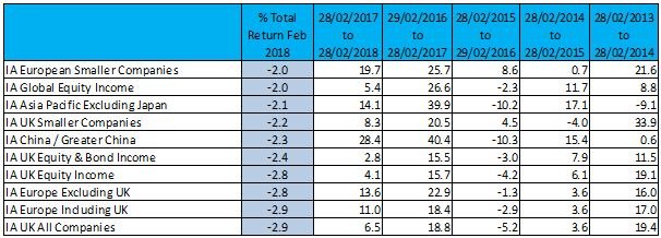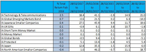 Although investors should be aware past performance is not a reliable indicator of future results, here are the top and bottom ten Investment Association funds and sectors for February 2018 in full: