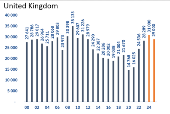 Although markets think interest rates will fall this summer, the worst is still to come in terms of insolvencies. Allianz predicted that as many as 31,000 firms could go bust this year. This will then fall to 29,000 in 2025.