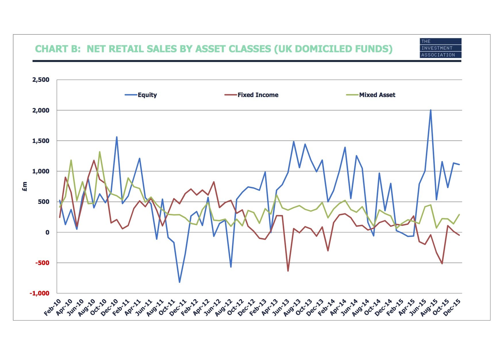 Tracker funds also had a record year, with retail sales of £5.4bn, and an all time high for funds under management of £108bn.Fixed income funds saw a record net retail outflow of £519m in 2015 (investors leaving funds), compared to a net retail inflow of £1.5bn in 2014.