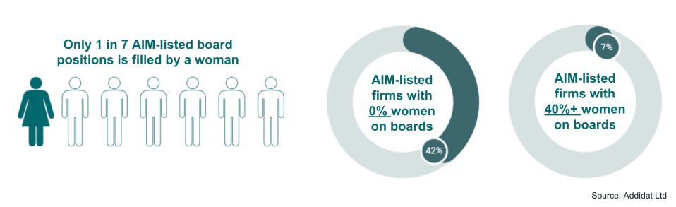 By contrast, the proportion of women on board roles across the FTSE 350 has risen above 40% according to the recently published FTSE Women Leaders Review; whereas only 7% of AIM-listed companies meet the same criteria.