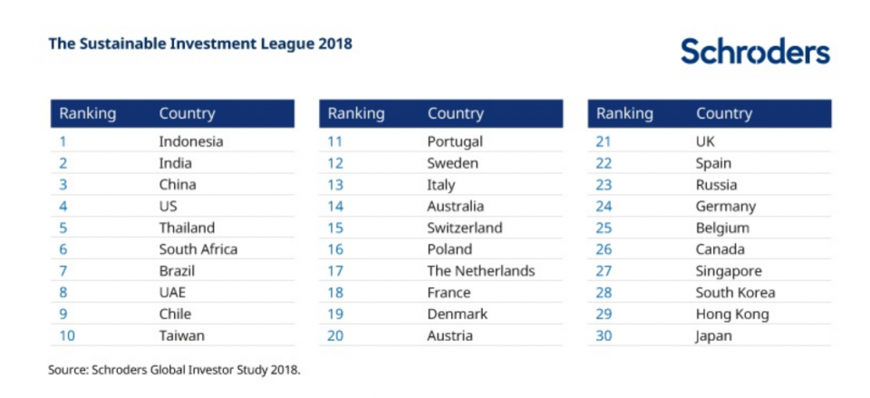 The study, which surveyed more than 22,000 investors across the globe, asked people about their understanding of what it means to invest sustainably, how they behaved sustainably in their everyday lives and how much they invested in sustainable products.