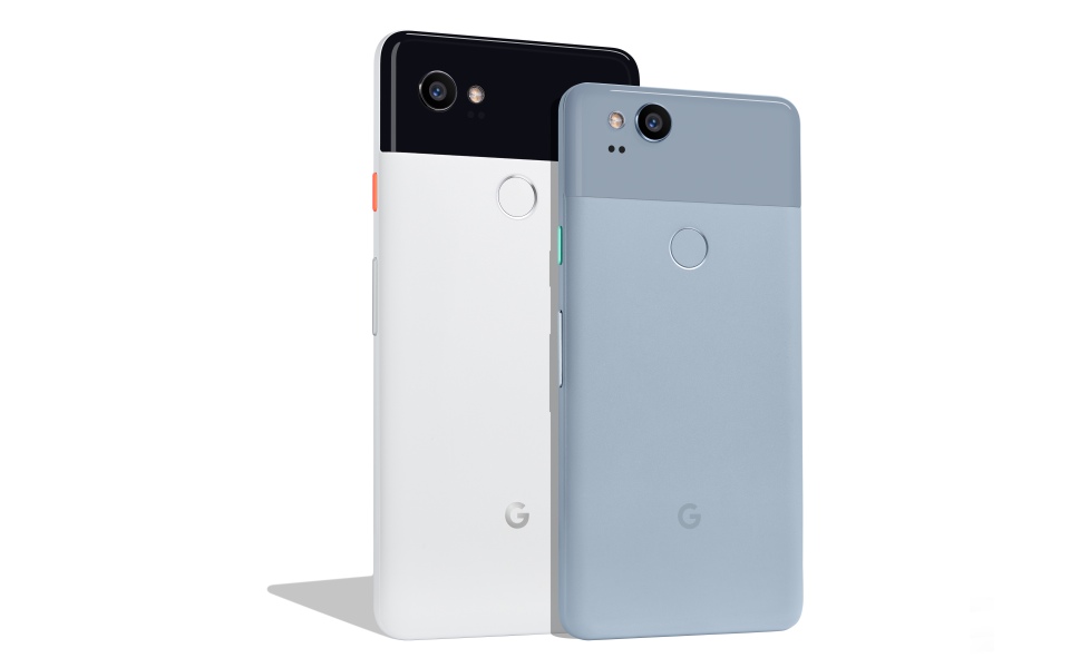The Pixel 2 XL in black and white, and the Pixel 2 in blue