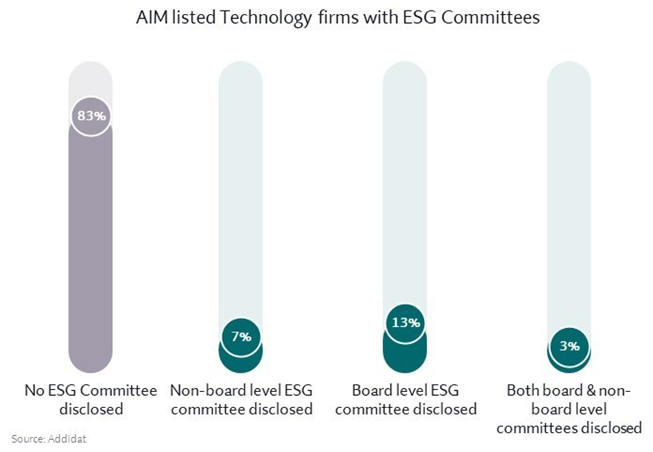 It is also unusual that more technology firms have established board level ESG committees than below board committees. Generally, across the AIM market, we see the reverse. The latter, more common trend might be explained on the grounds that organisations prefer to seed ESG committees below board level and subsequently elevate them once the business reaches sufficient maturity and understanding. It is unclear why technology is an outlier.