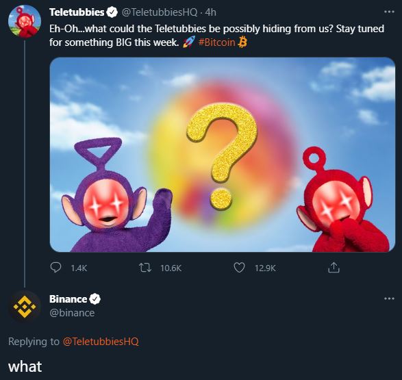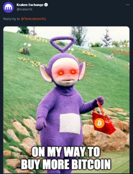 Binance were quick to reply to the Teletubbies tweet with a simple “what”, while Kraken went one step further with a meme of Tinky Winky “on my way to buy some more Bitcoin”.