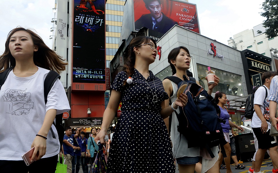 The look for Seoul’s men-about-town seems to involve shiny, black, mop top hairstyles, teamed either with long, black Crombie-style coats and polo-neck sweaters, or ankle length white padded duvet style jackets. Many women sport pale, chalky complexions teamed with red lipstick. Considering how big the beauty business is here – much of it centred in the teeming district of Myeongdong – no self-respecting Seoul girl would be seen looking anything less than perfection.