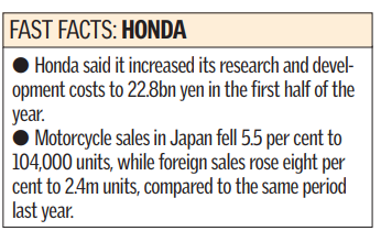 Honda also boosted its full-year global vehicles sales forecast to 3.425m units from its earlier projection of 3.415m units, and raised its full-year combined sales projection for motorbikes and all-terrain vehicles to 10.57m units from 10.09m.