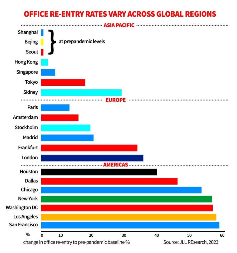 The rise of hybrid working and working from home during the pandemic has left cities across the world facing up to new challenges – but the rate at which staff are returning to their offices is different across the world.