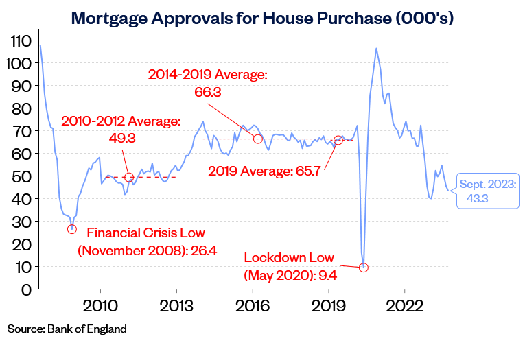 “Nevertheless, housing market activity has remained extremely weak, with just 43,300 mortgages approved for house purchase in September, around 30 per cent below the monthly average prevailing in 2019.