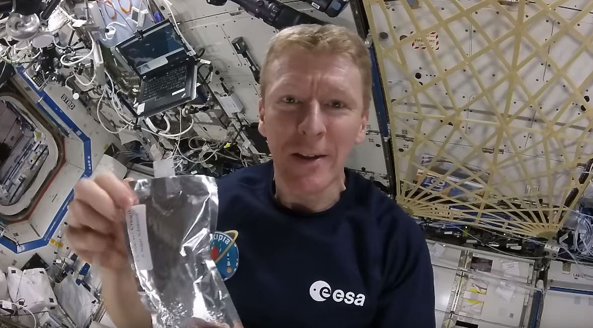 Tim Peake shows the sad reality is still covered in foil and vacuum packed.