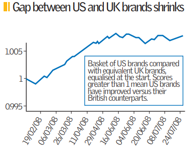 The graph shows the two baskets equalised at the start. In fact the actual average scores place the British brands considerably higher than the US ones.
