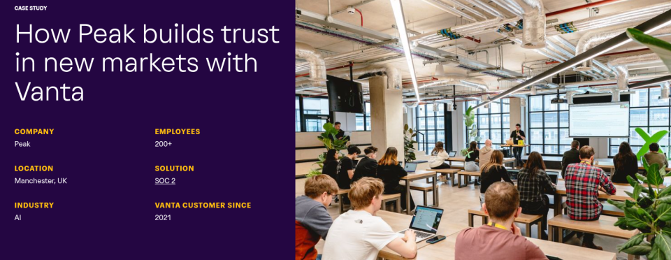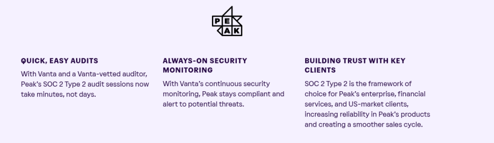 Since starting with Vanta, Peak has gotten its SOC 2 Type 2 attestation, which has led to a streamlined sales cycle, particularly when it comes to US-based enterprise customers.