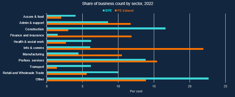 Private equity backed companies tend to be more concentrated in tech, finance and insurance, and professional services than other UK businesses, the data reveals.