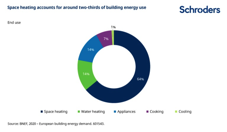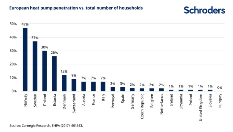 Under the IEA’s roadmap, heat pumps meet 50% of heating demand by 2045, from a tiny starting position today. However, heat pumps are not the only way to decarbonise heating, hydrogen can also play a role, as can district heating systems (a system for distributing heat generated in a centralised location through insulated pipes). There are certainly certain parts of the world to which heat pumps are better- or worse-suited, depending on factors such as the cost of the prevailing technology, and how well-insulated the housing stock is. This explains why heat pumps are often used in the Nordics, but rarely in the UK at present.