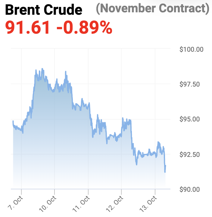 This afternoon, Brent Crude and WTI Crude are trading at $91.40 per barrel and $86 per barrel respectively.