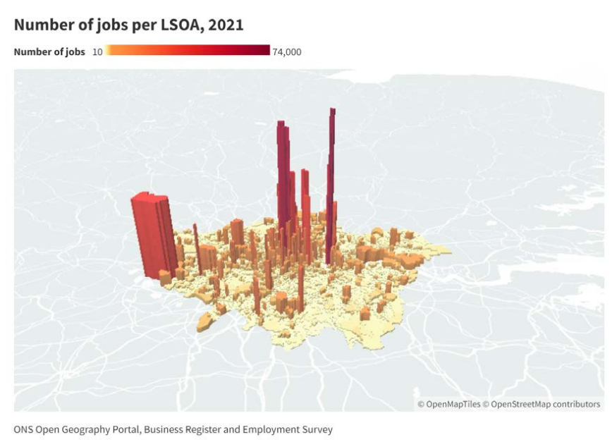 The five boroughs with the highest numbers of jobs in 2021 were all in inner London – Westminster, Camden, Tower Hamlets, Southwark and Islington.