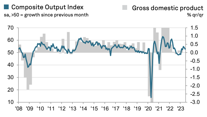 Overall services activity is growing but at a slower pace, with the pair’s index slimming to 53.7 in June, down from 55.2 in May. The reading was above the 50 point growth threshold and in line with the City’s expectations and an initial estimate.