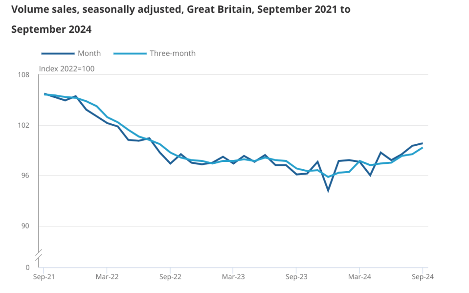 This was reinforced by this morning’s retail sales figures, which showed a surprise increase in sales volumes in September. Over the past year, retail sales have increased 3.9 per cent, the largest annual increase since February 2022.