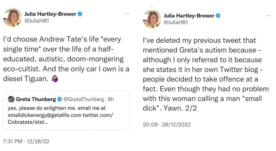 Commentator Julia Hartley-Brewer then took to social media defending Tate, before deleting her tweet – following a backlash.