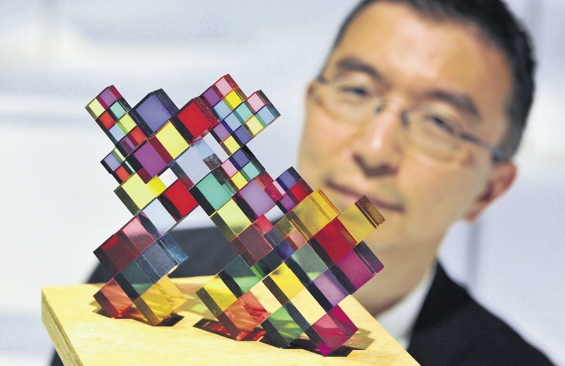 Japanese architect Sou Fujimoto, inspecting Stacked Colours, one of 100 items on display as part of his exhibition, Futures of the Future at Japan House