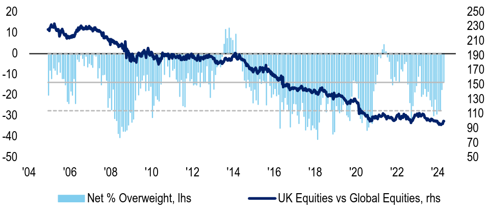 Global investors have been consistently negative on the UK since July 2021, and have been underweight it against global equities since 2014.