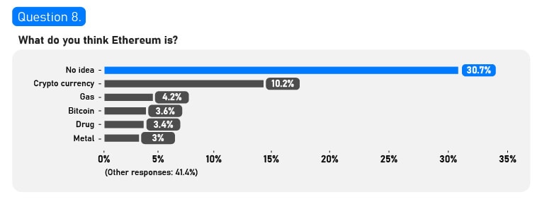 This is evidenced by the third most common response being that Ethereum was a gas, which accounted for 4.2 per cent of respondents. Other misconceptions about the nature of Ethereum are that it is a drug (2.4 per cent) or that it was a metal (3 per cent).