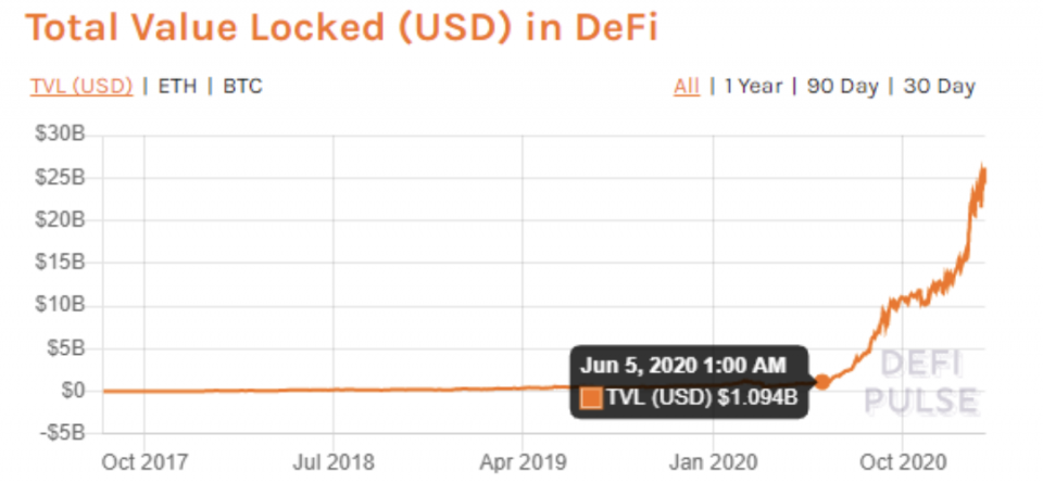Although DeFi is a relatively new concept, it gained $1bn in TVL over its first three years, which put the sector in the top 40 most valuable digital assets, [according to CoinGecko]. The chart above shows the exponential growth of total value locked (TVL) on DeFi since, October 2017. As we can see, the TVL has skyrocketed from $1bn to over $25bn in the past 6 months, which has provided investors with a plethora of new investment opportunities.