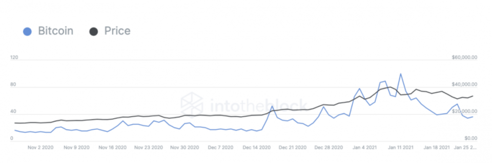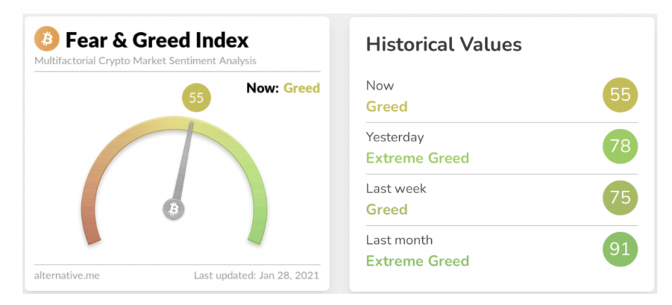 The sentiment Index has dropped back into boring-old Greed, down from 78 to 55. After months in Extreme Greed, it’s been a turbulent week for sentiment, which has been flung from 78 to 40 and back again. It seems the market is still figuring out where it wants to go next, though it’s important to note that Greed is still a bullish indicator.