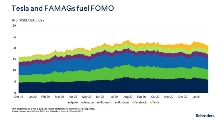 The chart below illustrates how the US market became increasingly dominated by a small number of stocks, the FAMAGs (Facebook, Amazon, Microsoft, Apple and Google) and Tesla. As a result of their surging share prices, these six stocks now account for 21% of the MSCI USA index of 600 companies, and 22% of the S&P 500 index, which Tesla only joined this year.