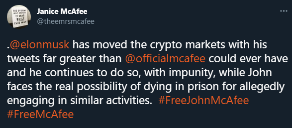 “Elon Musk has moved the crypto markets with his tweets far greater that John McAfee could ever have,” she said.
