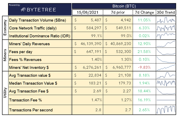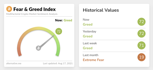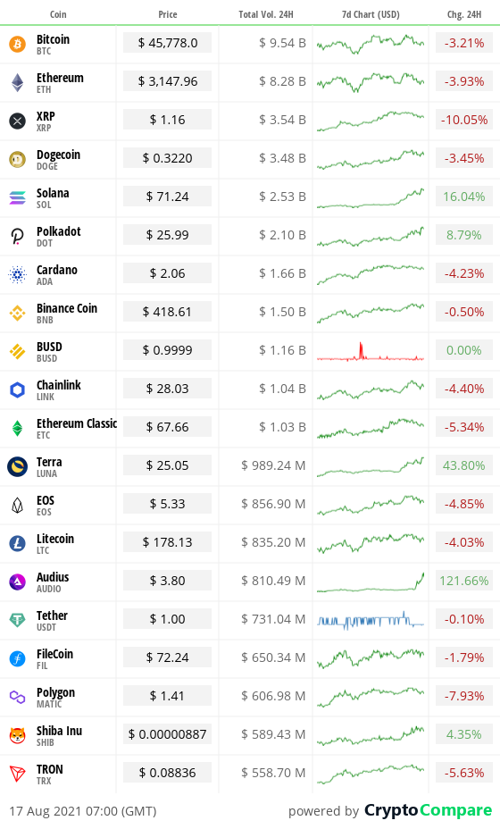 We closed yesterday, 16 August, 2021, at a price of $46,004.48, down from $47,047.00 the day before.