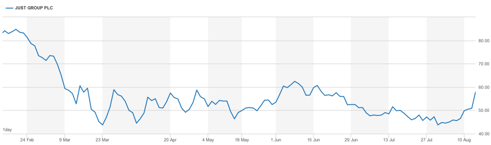 Just Group enjoyed a bumper share price boost of 14.5 per cent to 58.3p on the back of today’s results, though that is still far off its pre-pandemic level of 83p.