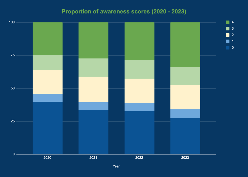 You can see that the proportion of higher scoring disclosures has increased with time. Equally encouraging is the decline in the proportion of material disclosure topics that are getting entirely ignored by companies, (which the Integrum ESG Platform highlights by awarding an ‘Awareness Score’ of 0) decreasing from 40 % to 27 %.