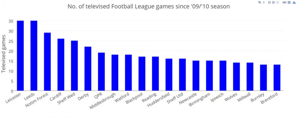 We crunched the numbers and found that since the beginning of the 2009/2010 season, Leeds United and Leicester City have had more live Football League games (excluding play-off matches) broadcast on Sky Sports 1 or 2 than anyone else, with 35 matches each.