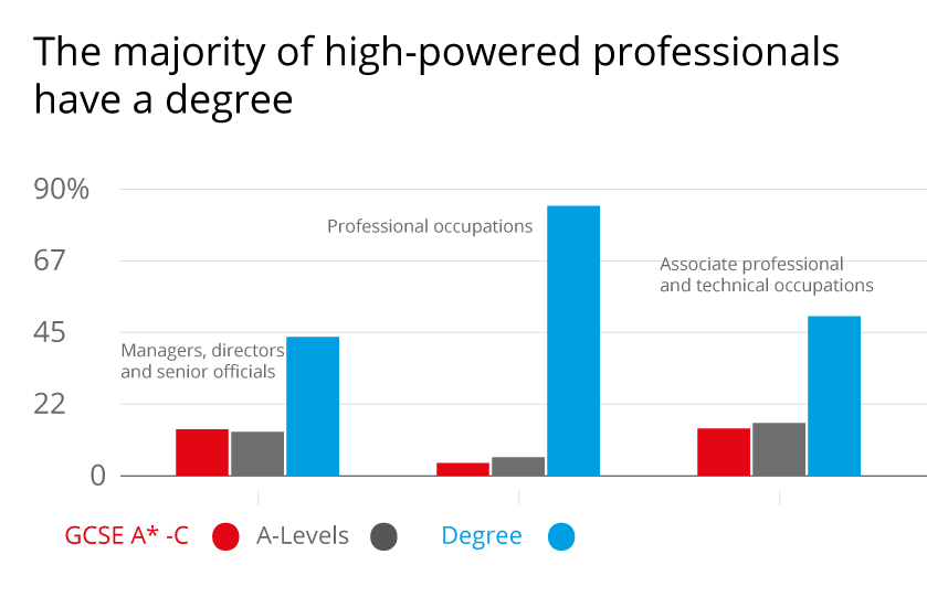 The career-boost given by a degree is even more pronounced in professional occupations, where 4 per cent stopped at GCSE, 5.8 at A-Level and 84.7 per cent went on to higher education.