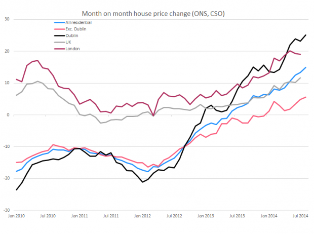 As the chart shows, prices excluding Dublin are growing far more slowly than the other series.
