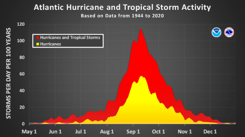 The Atlantic hurricane season, which runs from June to November, peaks in September.