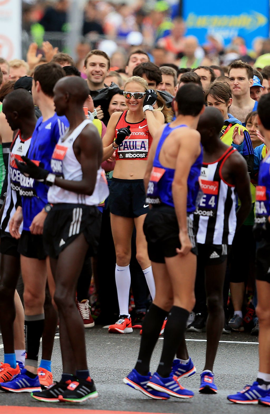 Women's record holder Paula Radcliffe lines up at the head of the mass start for non-elite runners as the men's elite race starts