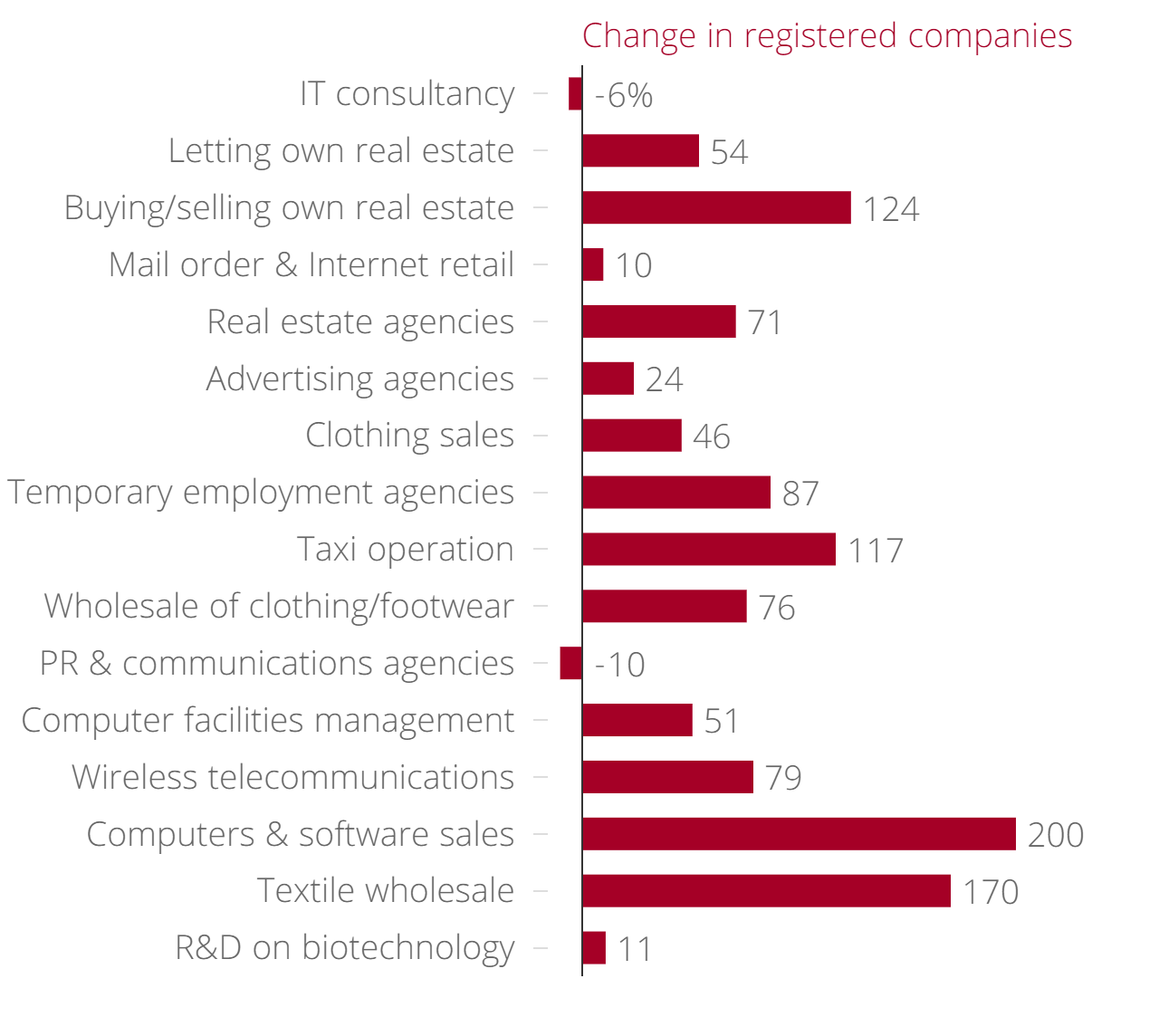 Tech continues to be a key growth sector in the capital, as technology services shot up by an eye-watering 200 per cent, and the wireless and telecommunications industry by 70 per cent.