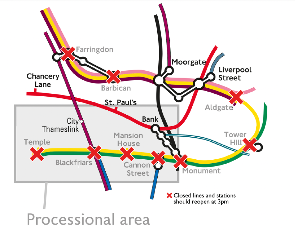 Barbican, Moorgate and Monument stations are out of action, and it will not be possible to come to return leg of the Show via Temple or Blackfriars, or to walk over the river from Southwark station.