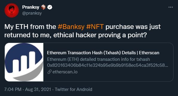 “Just to add a comment, to those who feel this may have been some sort of stunt, I would never risk a future relationship with Banksy or any fine artist by hiring someone to hack their website and then buying an NFT from myself,” he commented on Twitter.