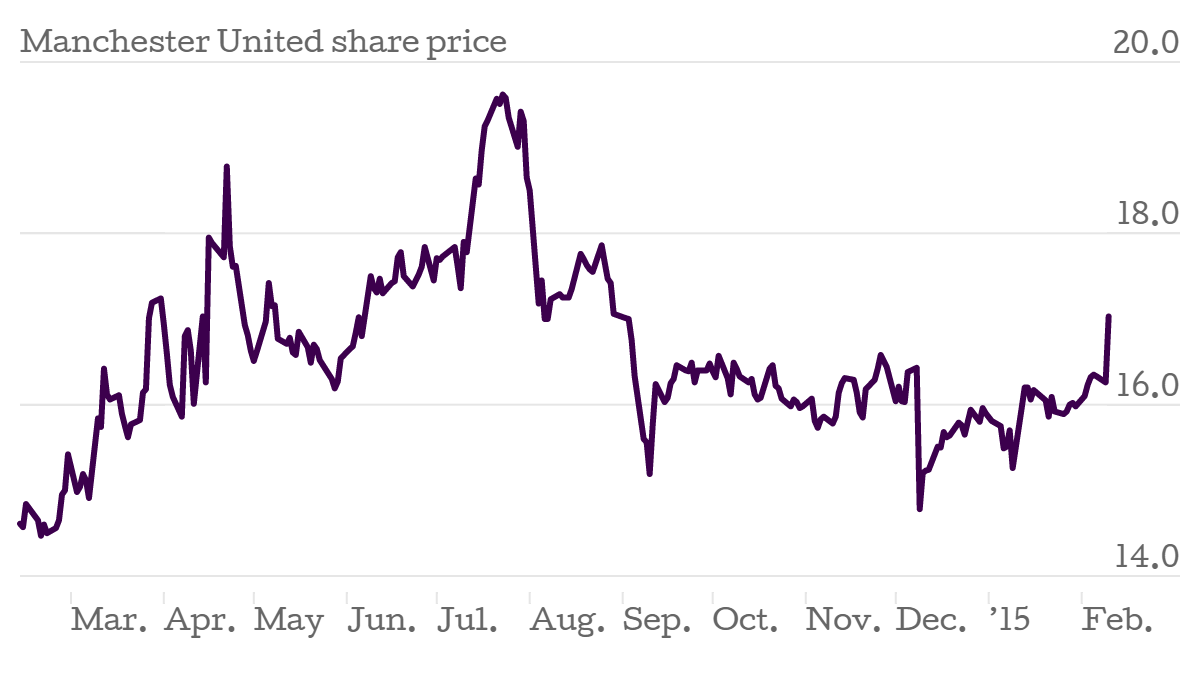 Manchester United’s share price rose on the New York Stock Exchange yesterday, rising by almost five per cent to a price of $17.03 per share.