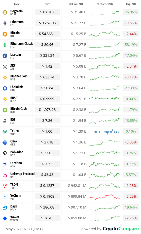 It was a similar story for Bitcoin, which has taken a knock of about three per cent since yesterday. The leading cryptocurrency is currently changing hands for around $54,500, having fallen to just above $53,000 before rebounding. This level is becoming increasingly familiar for Bitcoin, as it continues to consolidate. Bitcoin’s market dominance is now down to just 46 per cent, while Ethereum accounts for over 17 per cent of the market. This is an impressive turnaround on the start of the year for Ethereum, though it remains some way off its peak in June 2017, when it accounted for more than 33 per cent of the entire market cap.