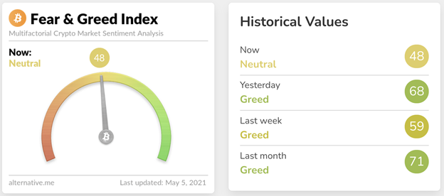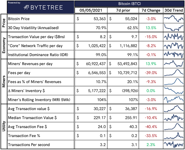 We closed yesterday, May 4 2021, at a price of $53,333.54, up from $57,200.29 the day before.