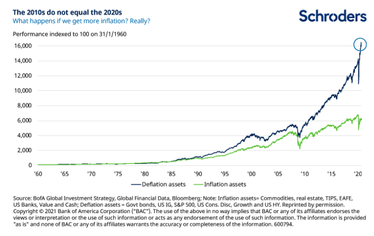 The chart compares the performance of a range of deflation assets, including government bonds, to the performance of inflation assets, such as commodities, real estate and high yielding stocks.