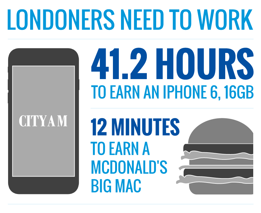 Londoners have to work an average of 41.2 hours to be able to buy an iPhone 6 – far more than their counterparts in New York City, LA, Miami, Chicago, Zurich or Geneva, where it takes less than 30 hours to notch up enough readies to splurge on the smartphone.