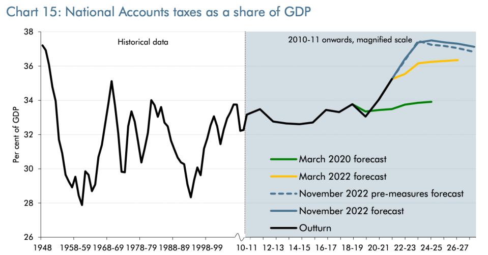 The OBR reckons taxes as a share of the economy will peak at 37.5 per cent, the highest level since the end of World War II.
