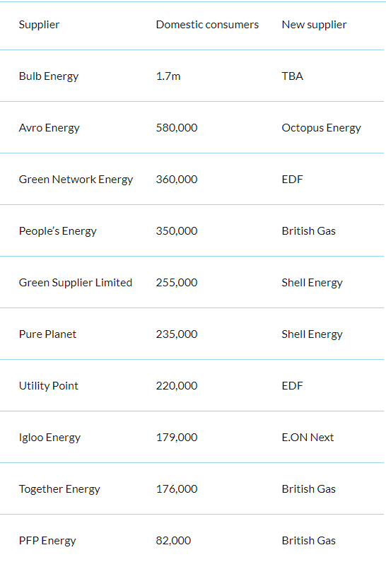 Minor issues | Bulb Energy (administration), E.ON, Octopus Energy, Outfox the Market, Ovo Energy, Shell, Utility Warehouse |