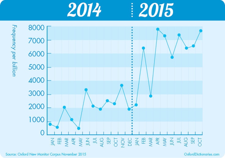 The Oxford Dictionaries Corpus crunched their own data to find usage more than tripled.